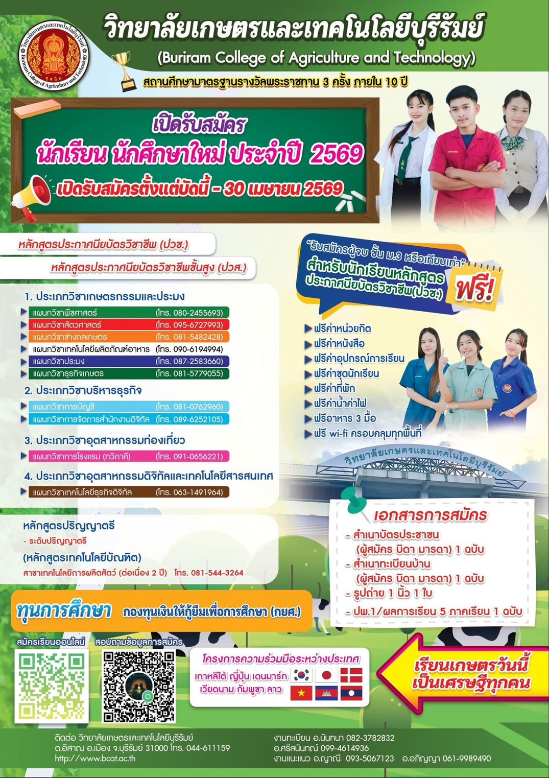 ประชาสัมพันธ์ : วิทยาลัยเกษตรและเทคโนโลยีบุรีรัมย์ "รับสมัครผู้จบ ชั้น ม.3 หรือเทียบเท่า" สำหรับนักเรียนหลักสูตรประกาศนียบัตรวิชาชีพ (ปวช.) |